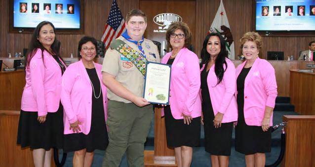 Dustyn Schellenberg, who led the Pledge of Allegiance at the October 4 Paramount City Council meeting, was also recognized for becoming an Eagle Scout, the highest honor in the Boy Scouts of America. “It takes years of hard work to gain this status, plus determination, intelligence, and leadership skills,” said Mayor Vilma Cuellar Stallings. “Dustyn’s Eagle Scout project was done at Emmanuel Reformed Church and will help the volunteer program there. This showed his devotion to our community. He is a fine young man and we’re happy that he’s a resident of our beautiful City.”
