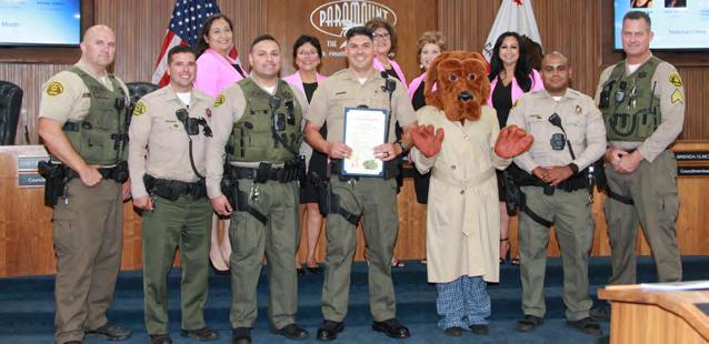 Members of the Paramount law enforcement team helped the City Council proclaim October as National Crime Prevention Month at the October 4 meeting. Thanks to the City’s strong relationship with the L.A. County Sheriff’s Department, and the dedicated efforts of folks like Neighborhood Watch members, Volunteers on Patrol, and City Community Service Officers and Code Enforcement Officers, Paramount has seen a large decline in serious crime for decades. Special guest was McGruff the Stop Crime Dog.