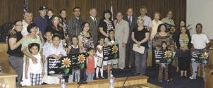 Outgoing President Kevin Lindsay receives recognition for his service as Chamber President in 2008/2009 from elected officials. From left: Incoming President Martin Johnson, Mayor Diane Martinez, Kevin Lindsay, Rachel Finlayson representing Assemblyman Isadore Hall, Erin Stibal representing Supervisor Don Knabe, Luis Marquez representing Senator Alan Lowenthal and Jesse Cheng representing Congresswoman Linda Sanchez.