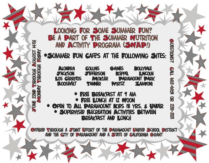 The Paramount Unified School District and the City of Paramount’s Parks and Recreation Department will be providing a Summer Nutrition and Activity Program (SNAP) called Summer Fun Café for students at all kindergarten through 8th grade schools in the District. The session runs until August 14. No registration is necessary.