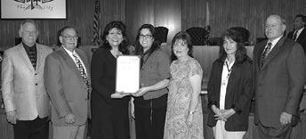 The Council celebrated April 12-18 as National Library Week and also introduced Chris Warburton as the new Library Manager for the Paramount branch. From left: Vice Mayor Tom Hansen, Councilmember Gene Daniels, Mayor Diane J. Martinez, Warburton, Councilmember Peggy Lemons, Librarian Assistant Nancy Taylor and Councilmember Daryl Hofmeyer.
