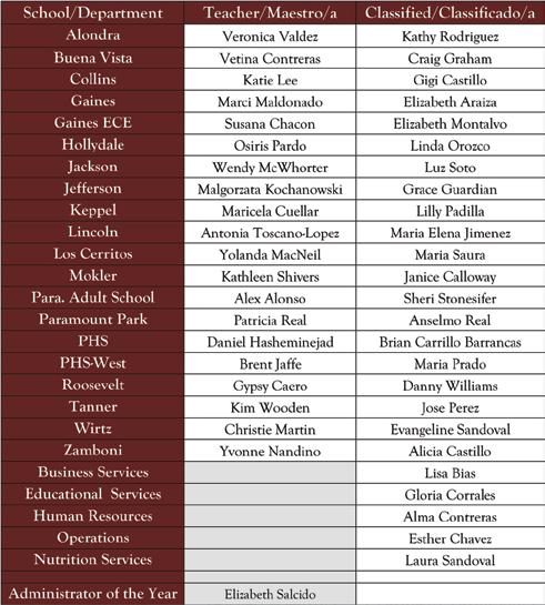 petirá por el puesto de maestra del Condado contra nominados de los distritos de todo el condado de Los Ángeles. Quienes salgan exitosos a este nivel, competirán en todo el estado y después nacionalmente por la nominación “Maestro del Año”. Además de reconocer al maestro y empleado del año, también se reconoció a la Sra. Elizabeth Salcido como administradora del año. Elizabeth ha servido como administradora en Paramount por más de una docena