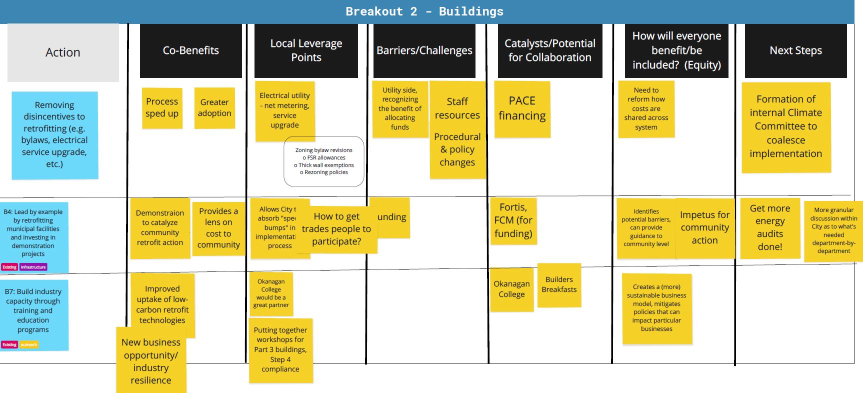 In the final breakout session of workshop 2, participants were asked to select one or two of the priority strategies and do a deep dive in terms of cobenefits, local leverage points, barriers/challenges, catalysts/potential for collaboration, equity and next steps. The Miro boards for this exercise can be seen in Figure 24, Figure 25, and Figure 26.