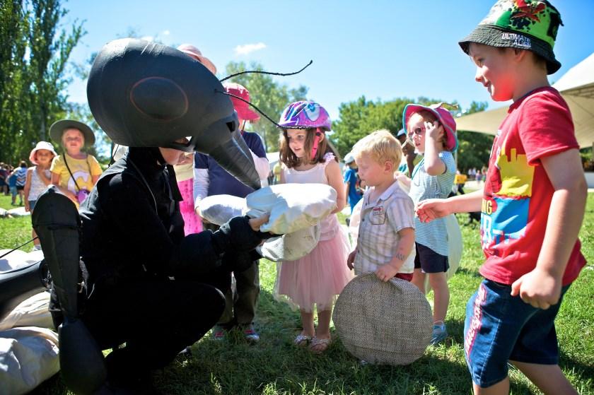 Ants as big as humans work together intently with hundreds of giant bread crumbs, using sound and movement to communicate, and children are irresistibly drawn closer to find out how they can join in. Gradually a world of meaning unfolds, with children's movement making lines and patterns, transforming public space and disrupting the everyday. Children choose how they interact with the big insects, becoming ant-like creatures themselves and taking part in their world. This is an enchanting and unusual experience that everyone can enjoy!