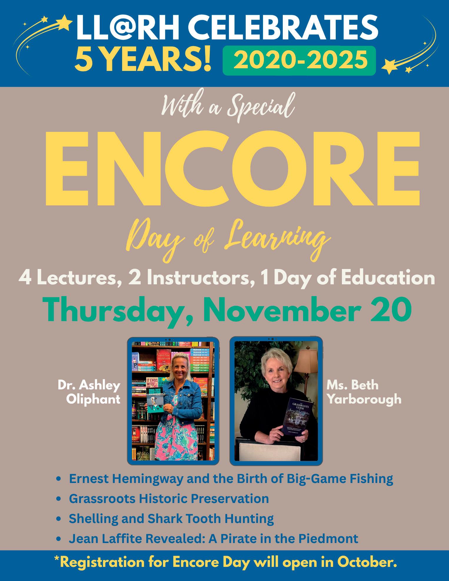 At the close of the semester, we’ll host an encore learning experience with retired professor, speaker and author, Dr. Ashley Oliphant, along with her mother, Beth Yarborough. Together, this duo will offer four different lectures. Details of this event will come later in the fall and registration will open in October. Stay tuned for more.