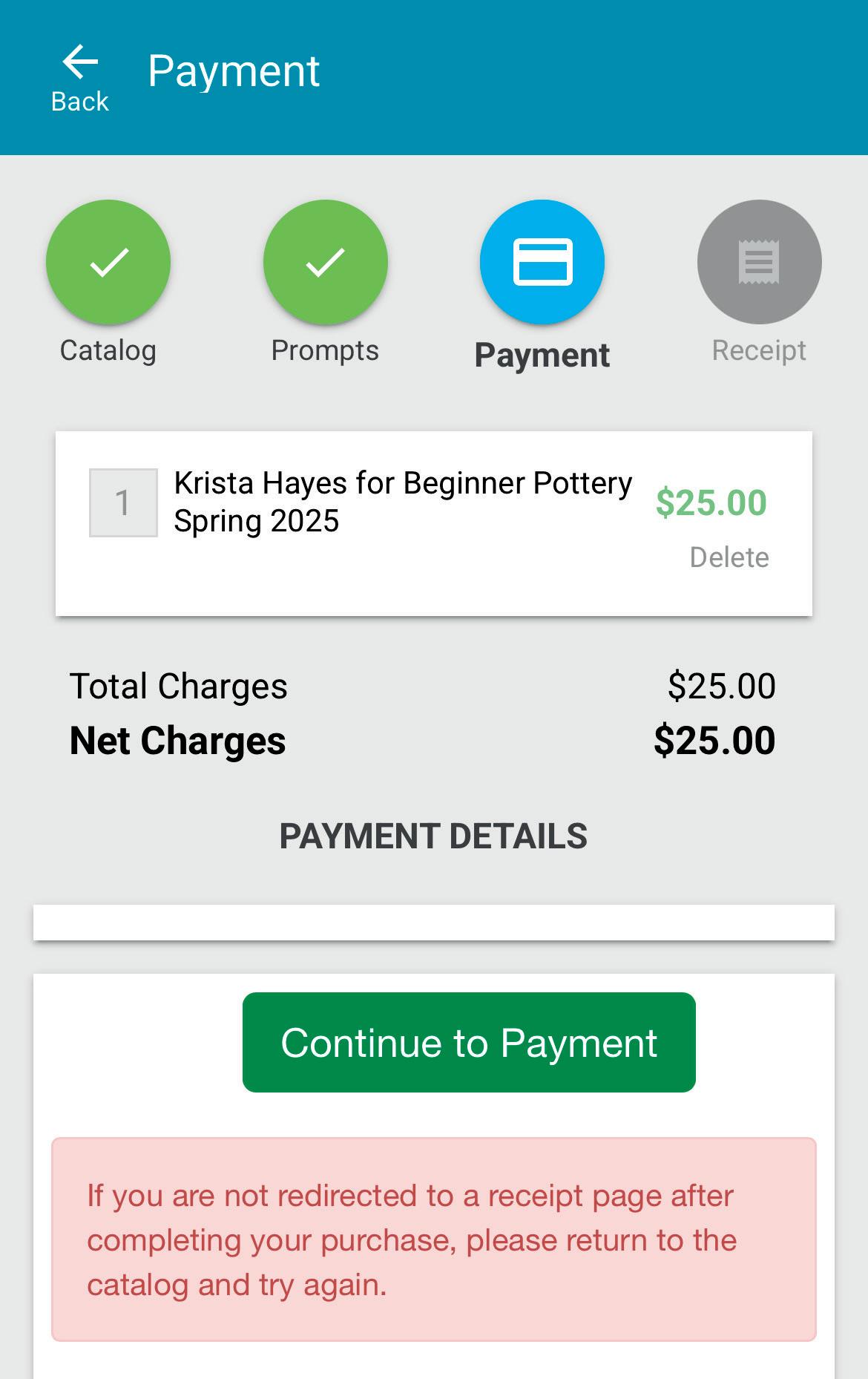 [7] When all classes have been added to your cart, click the CONTINUE TO PAYMENT link to complete your registration.