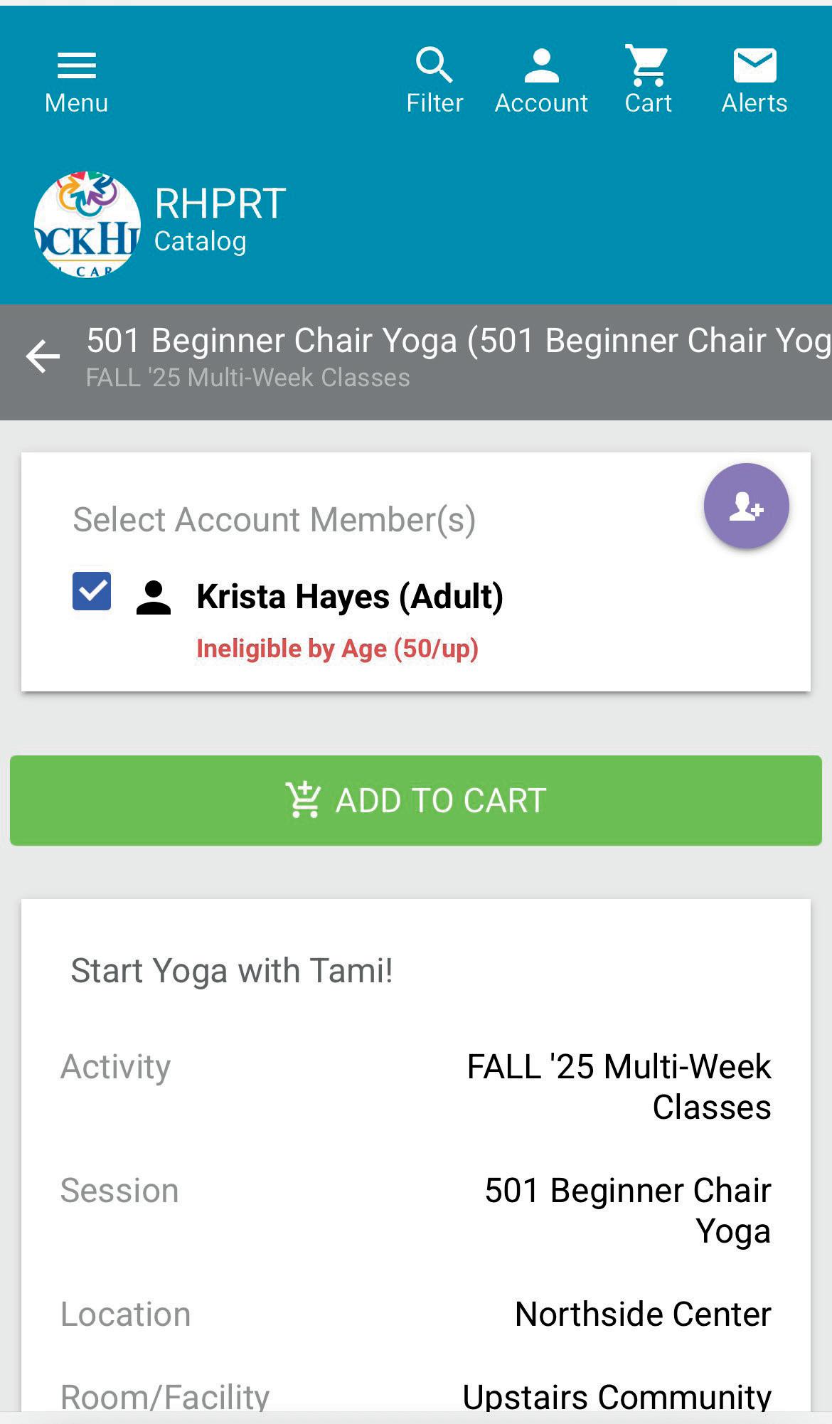 [6] Select the correct account member(s), then click the green “ADD TO CART”. Return to the Catalog from the top of the screen to view additional classes. When you are done adding classes to the cart, select the cart icon to complete the payment process.