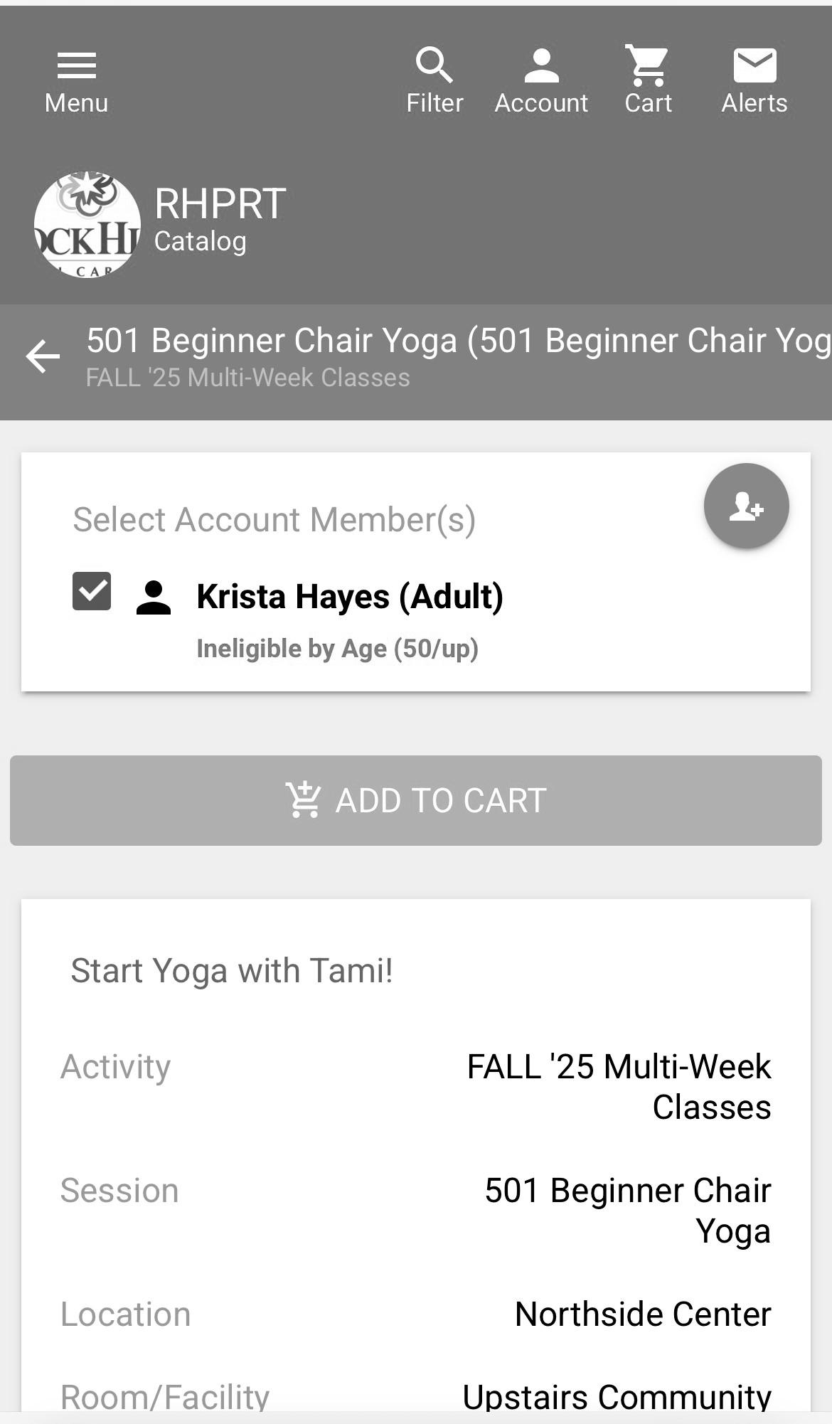 [6] Select the correct account member(s), then click the green “ADD TO CART”. Return to the Catalog from the top of the screen to view additional classes. When you are done adding classes to the cart, select the cart icon to complete the payment process.