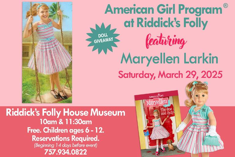 Riddick’s Folly hosts an American Girl event every two months, showcasing eight- to fourteen-year-old female characters of various ethnicities, faiths, nationalities, and social classes throughout different time periods in history. There will be two sittings for each event: 10:00 AM and 11:30 AM. Space is limited (20 girls per seating) and reservations are required. Donations welcome. Ages 6-12; all children must be accompanied by an adult. Call for reservations at 757-934-0822 or email riddicksfolly@verizon.net, beginning 14 days before each event. If you are unable to attend the program (once you have a reservation), please call the museum. There is always a waiting list no child should miss this opportunity!