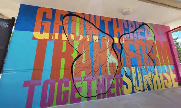 Local artist Lori Practico was selected to paint a public art mural next to the butterfly garden at Sunrise Sportsplex. The mural’s bright colors and bold words provide the backdrop for a transparent butterfly, creating an environment that vibrates with excitement and hope. The project celebrates the success of the Sunrise Be A Butterfly Hero program and encourages residents to make the connection between conservation and community strength. There are currently 272 certified wildlife habitats at Sunrise homes, schools, businesses and City facilities—including Sunrise Sportsplex.