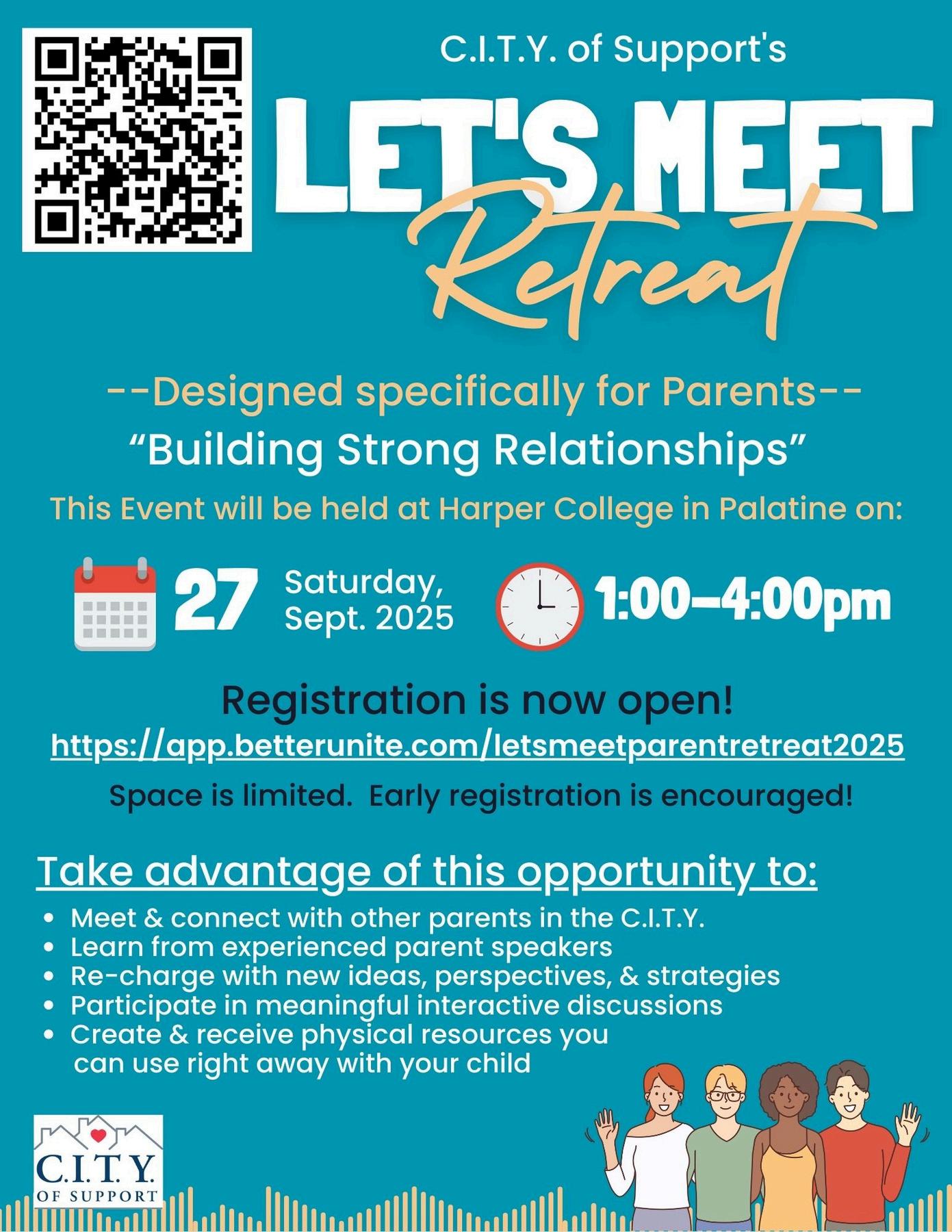 Our “Let’s Meet” Parent Retreat (September) takes a team effort to coordinate We would love your help in organizing this and other meaningful events in the next few months
