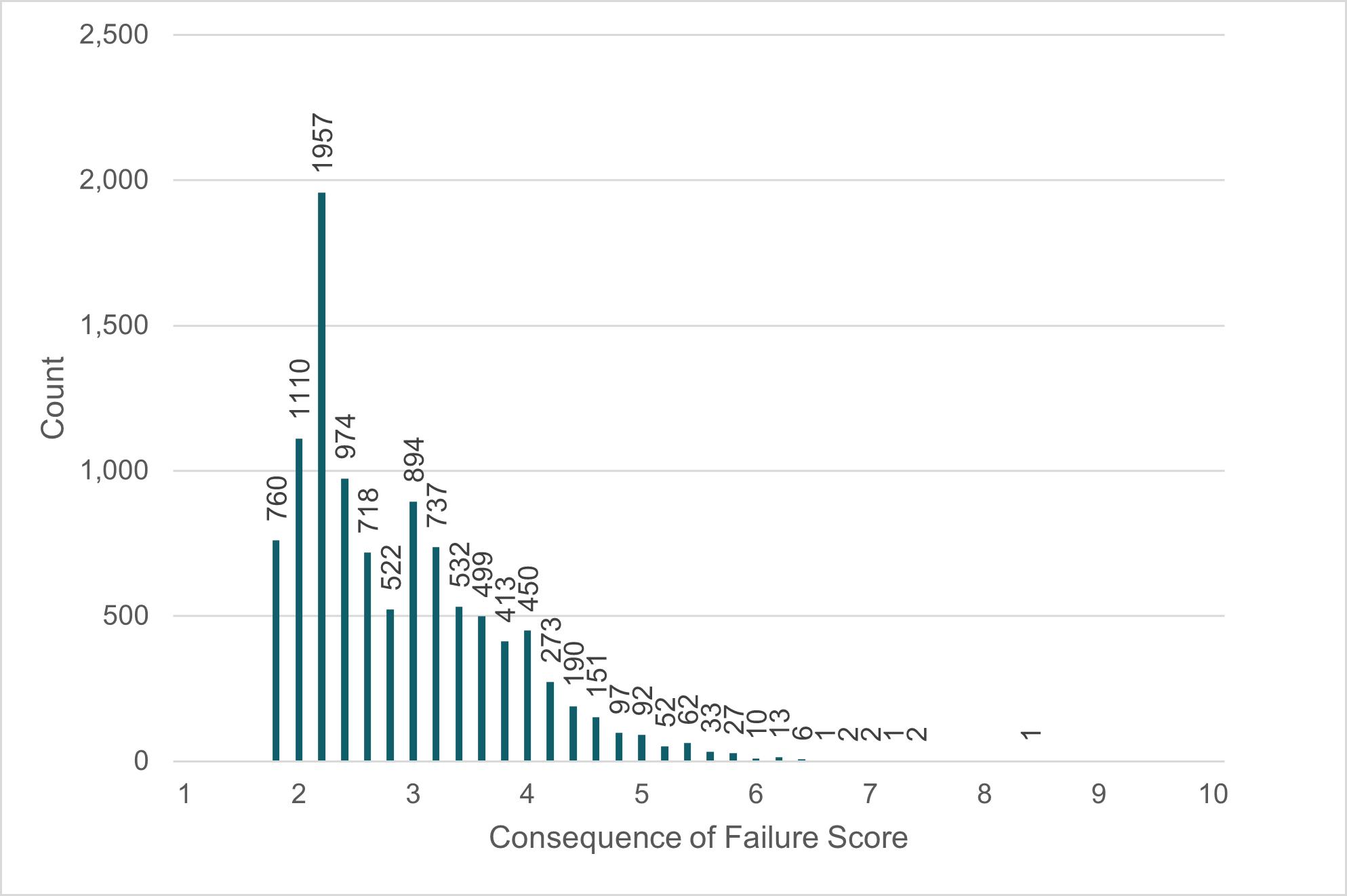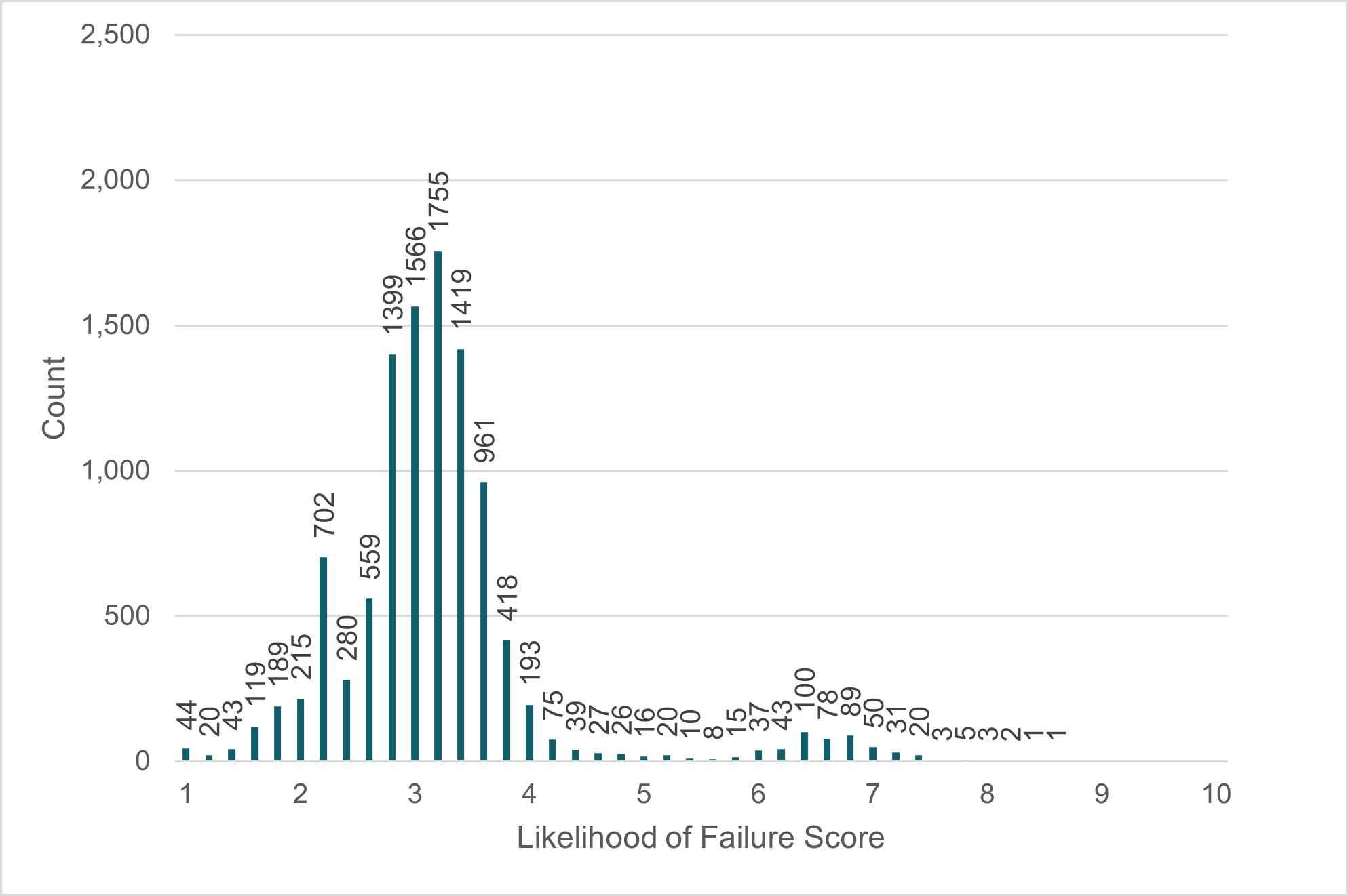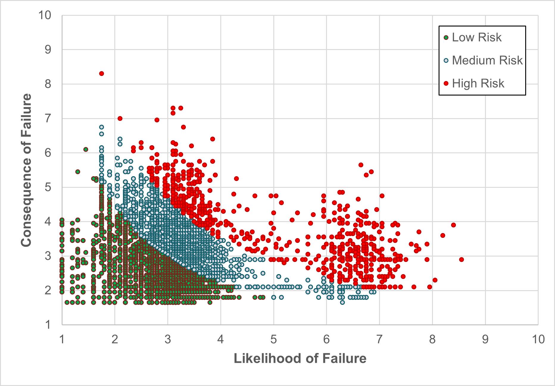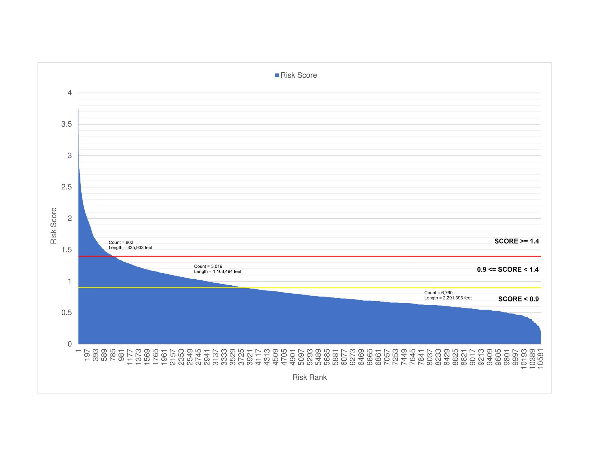 The Tyler system risk analysis identified 802 high-risk individual pipe segments (segments with an overall risk score greater than 1.4), equating to 64 linear miles, or approximately 10% of the system. These high-risk assets represent the pipes most likely to fail, as identified by the system condition estimate, as well as the most severe consequences should these pipes