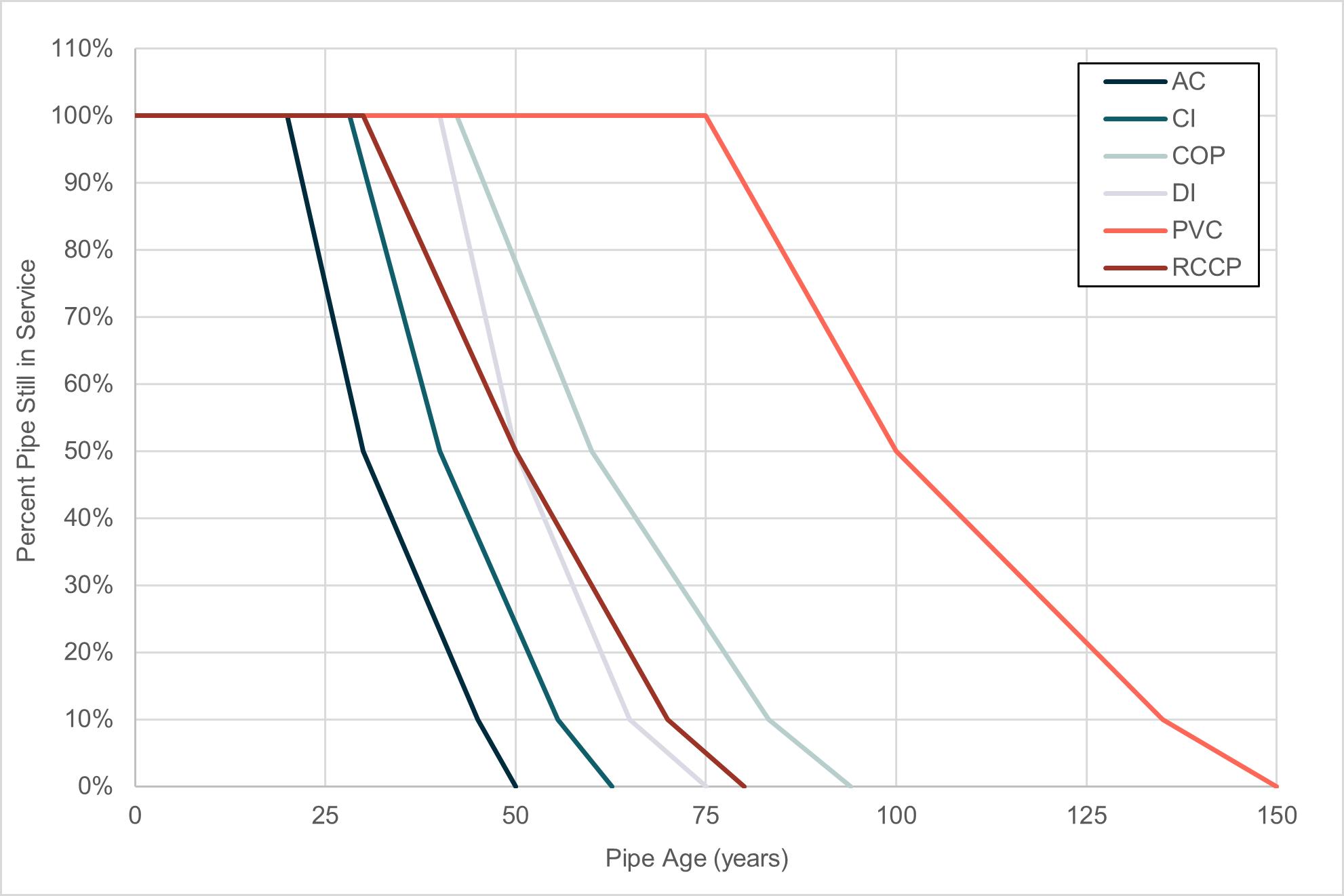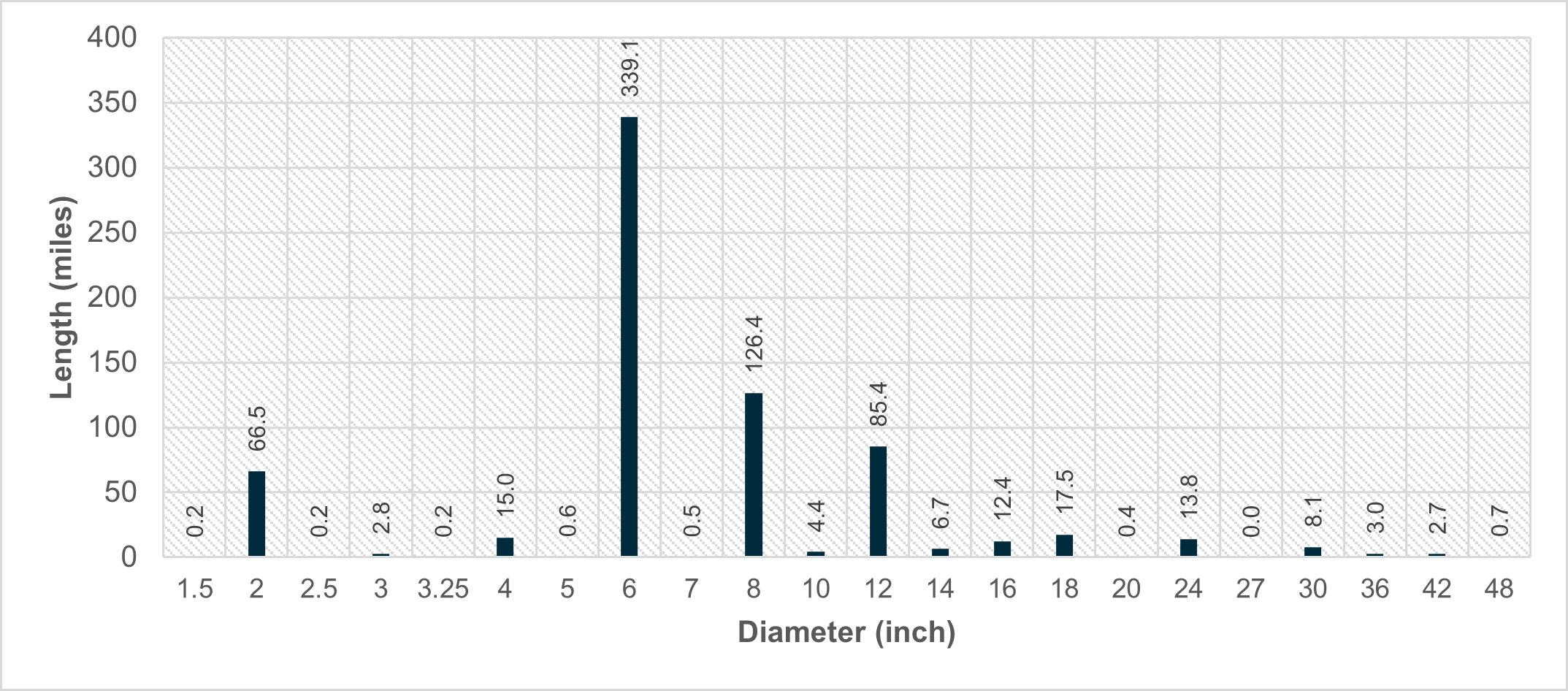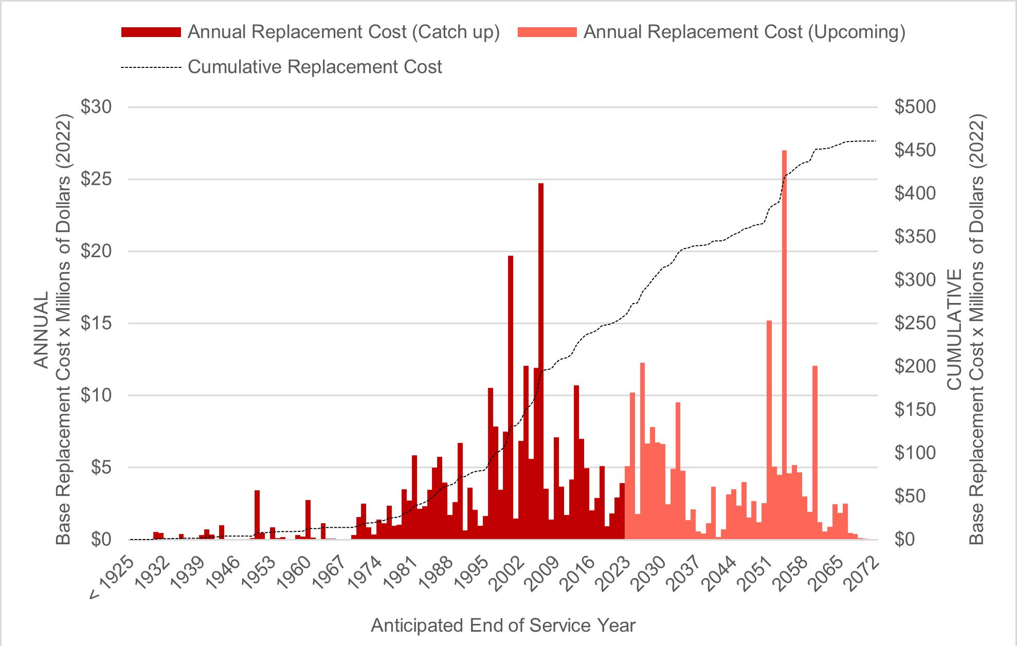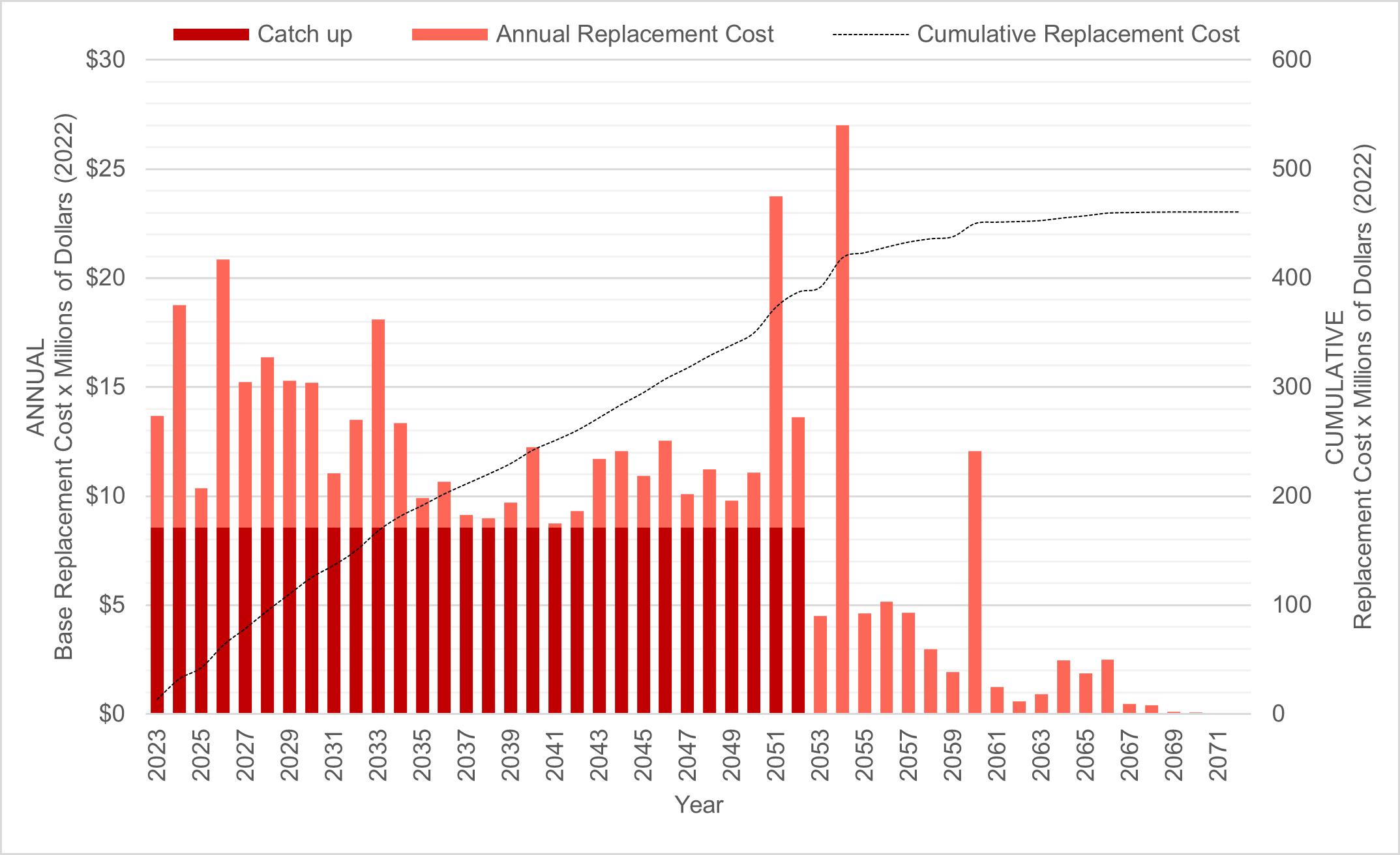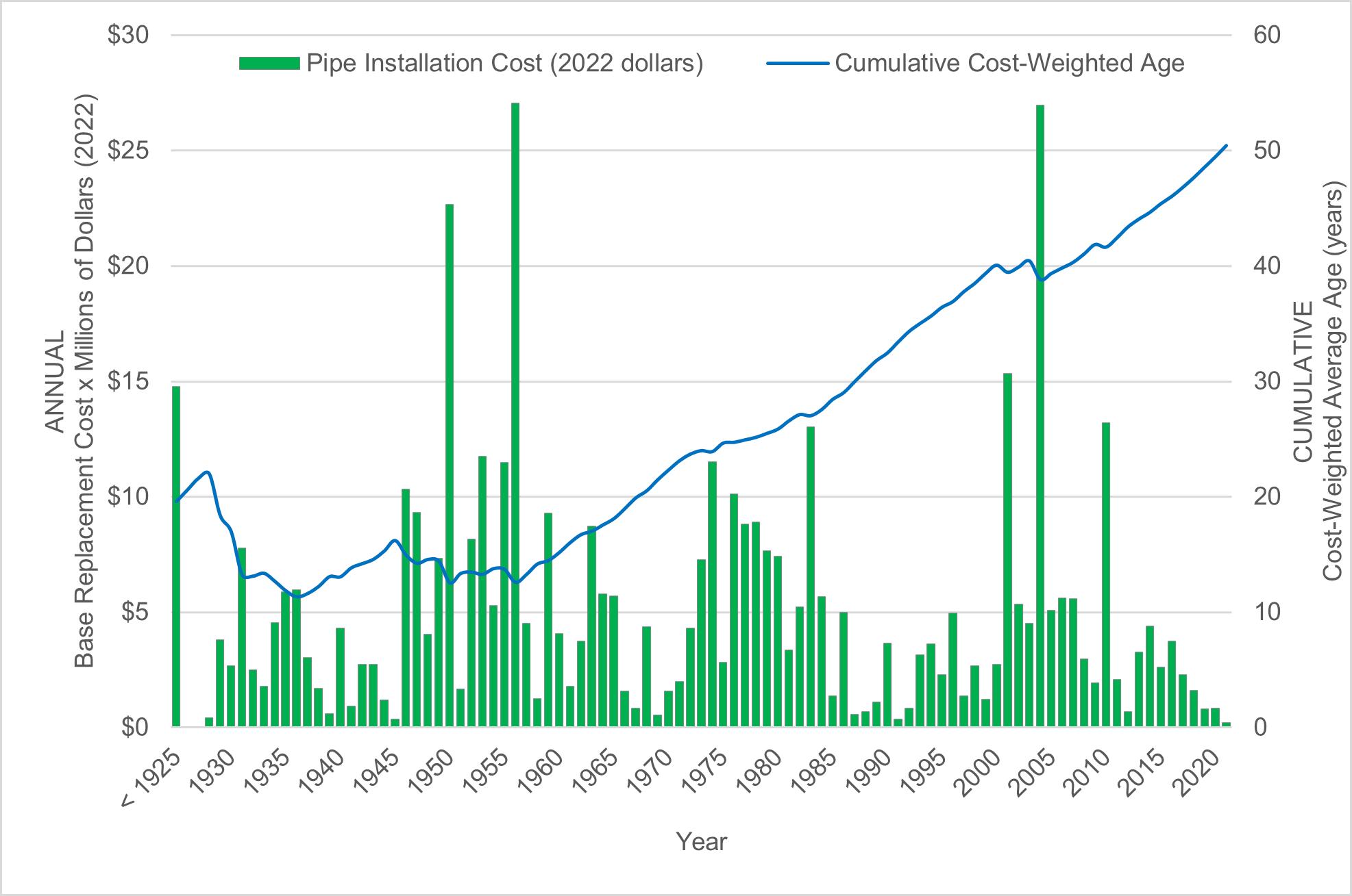 Replacement and rehabilitation costs, in 2022 dollars, were estimated for each pipe segment, with replacement representing the highest estimated cost and rehabilitation representing the lower boundary of estimated renewal costs. In 2022 dollars, the estimated cost to replace all water distribution pipelines is $485 million, and the estimated cost to rehabilitate all water distribution pipelines is $370 million. Also, in 2022 dollars, the estimated cost