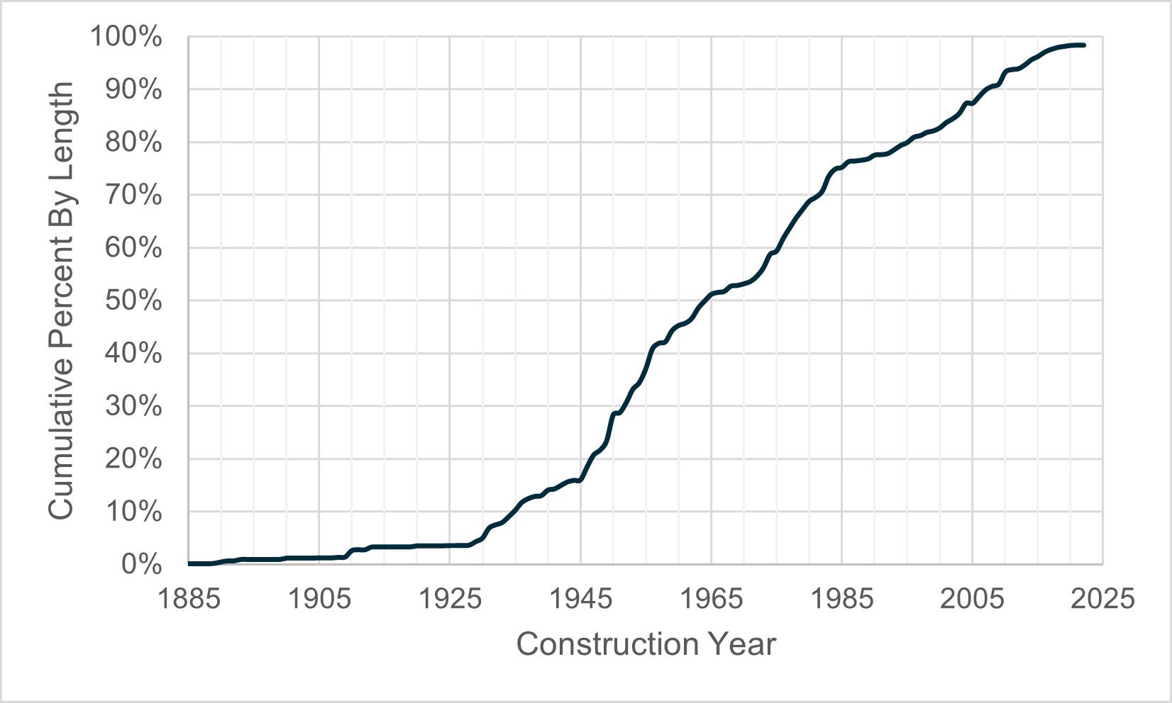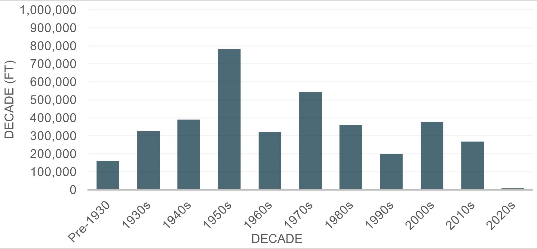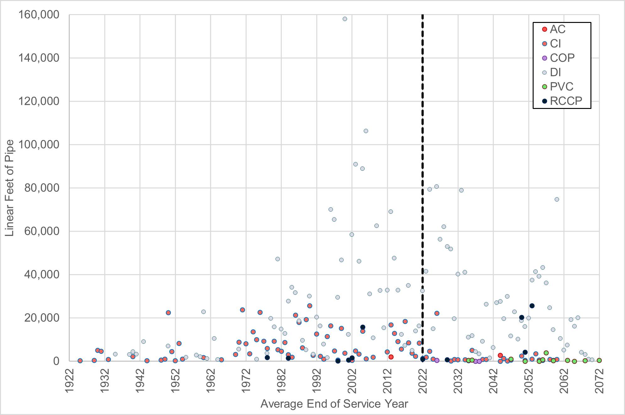 The maximum pipe age in the system is greater than 100 years, and the current average age of the system is over 50 years. Figure ES.1 shows the total footage of pipe installed during each decade.