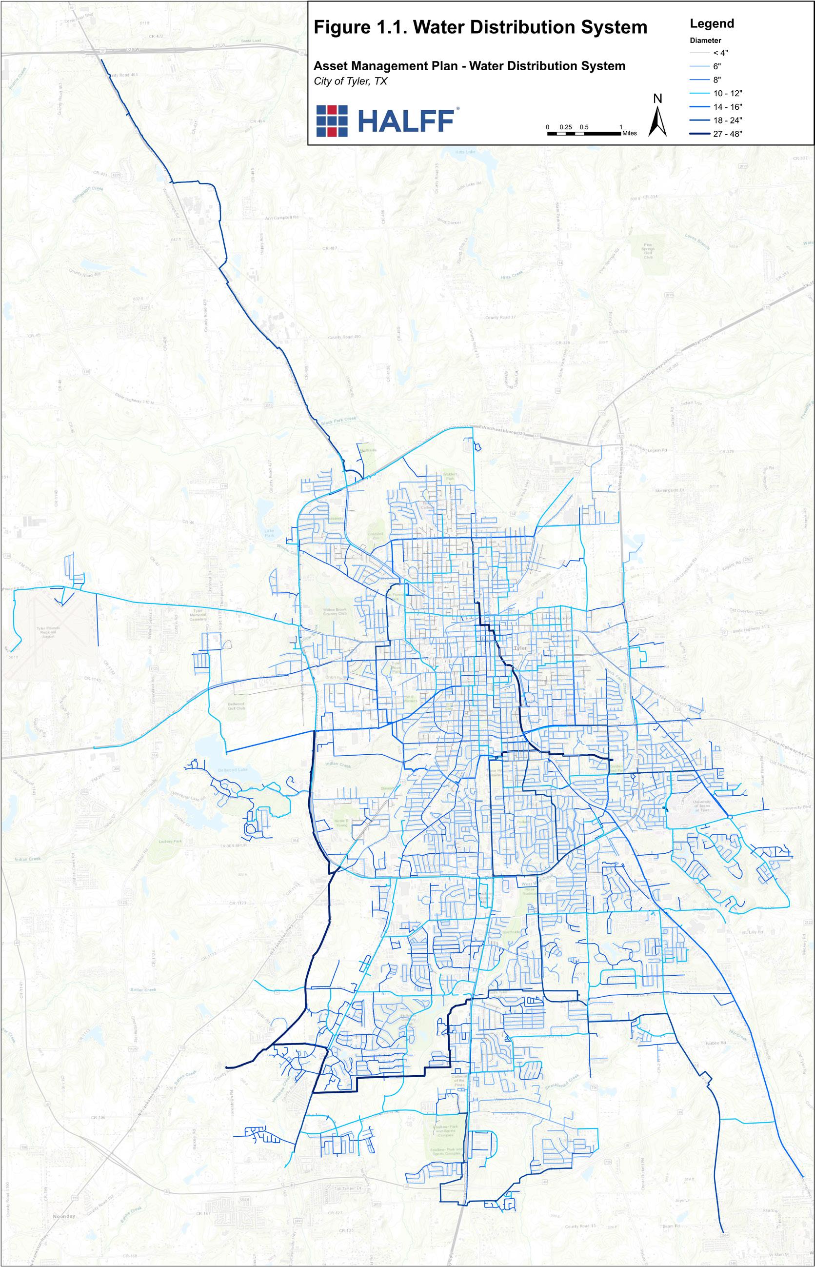 This Asset Management Plan for the City of Tyler’s water distribution system establishes methodology to prioritize pipeline condition assessment and renewal projects to optimize the allocation of limited funds to renew the assets at the most significant risk. Part one provides an inventory of the Tyler system, estimates condition and business risk exposure for each asset, and lays the groundwork for identifying existing and developing problems in the City’s distribution system. Part two assesses risk for all distribution system assets and presents inspection and investment plans for pipeline renewal. Applying a risk-based approach allows near-term and long-term projects to be effectively identified, planned, and executed. This Asset Management Plan should be updated every 3-5 years of active condition assessment/verification as the system’s structural and operational condition is assessed per the inspection plan outlined in this report.