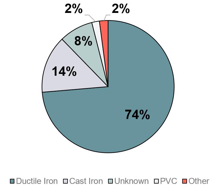 Pipe material preferences have remained fairly constant, with ductile iron pipe being the dominant pipe material installed in the Tyler system, followed by cast iron and PVC. Figure 1.3 shows the approximate distribution of water pipe materials in the Tyler system as a percentage of the total pipe length. The ‘Other’ category includes the following pipe materials: asbestos cement, copper, and concrete.