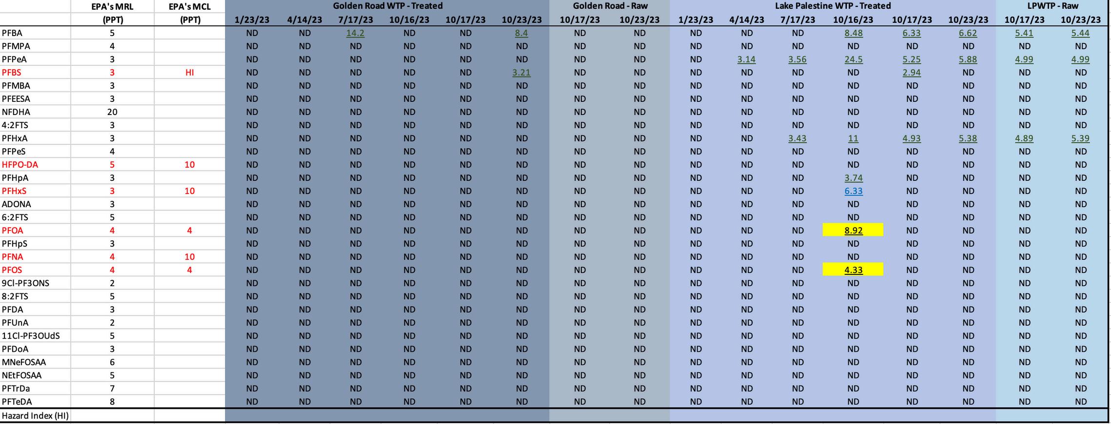 Two regulated PFAS with set MCLs were detected at Lake Palestine on Oct. 16. However, these were only detectedonceandnotdetectedinthefollowingtests completedonOct.17andOct.23.Webelievetheseare test anomalies and not reasons for concern at this moment.