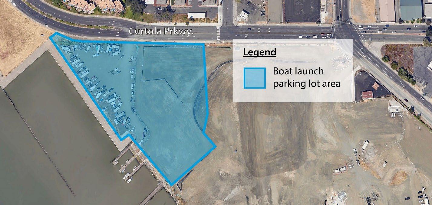 All work will occur in the boat launch parking lot area (see Figure 1), with some staging of equipment and supplies inside the larger enclosed City-owned property at the end of Mono Street and occasional activities in Curtola Parkway associated with required utilities upgrades and connections. Community members can expect to see a field crew of 10-30 individuals working with trucks and other construction equipment to support installation activities. You may experience some noise and truck traffic during this work.
