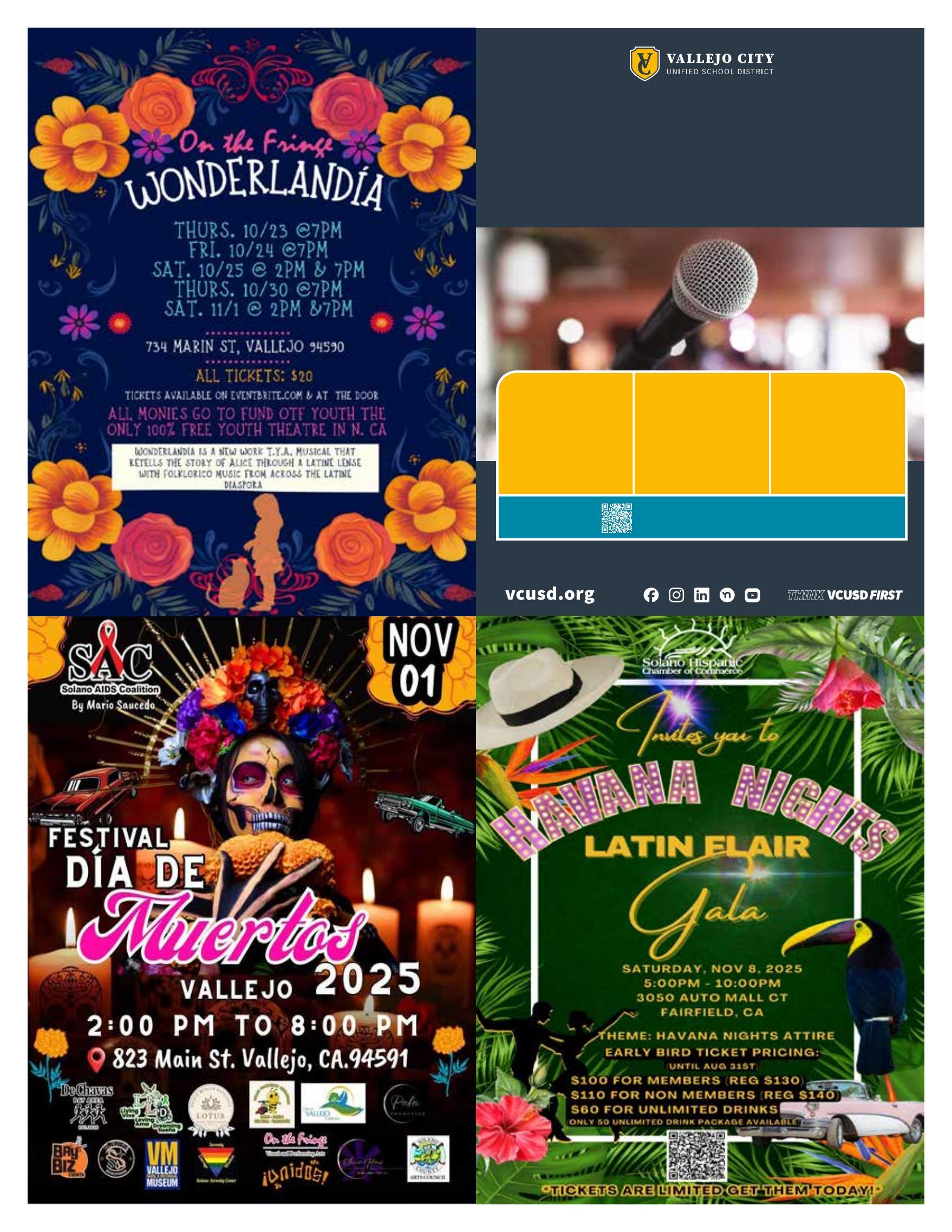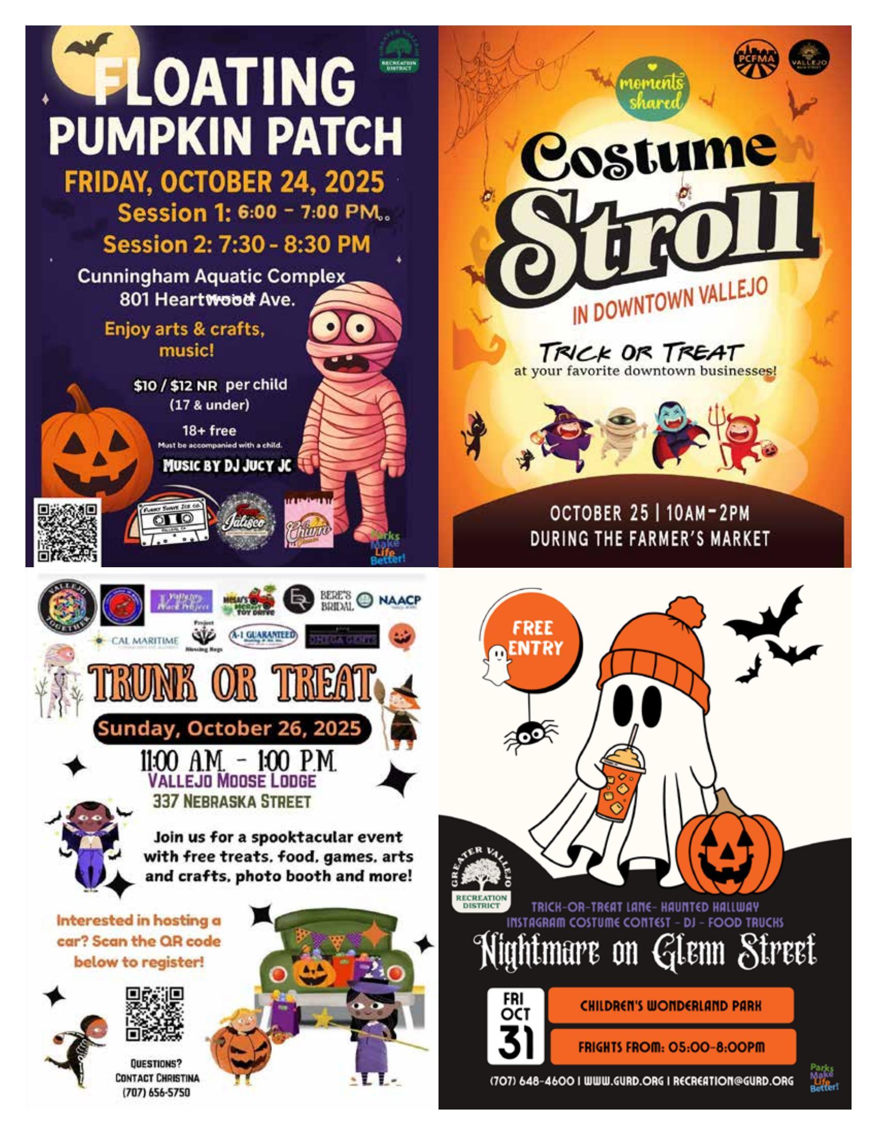 • Encontrarádetallessobreestosyotroseventos comunitariosenlaspáginasdelVallejoWeekly.Animamosa todosaparticipar,amostrarsuespíritudeHalloweenya disfrutardetodoloqueVallejoofrece.