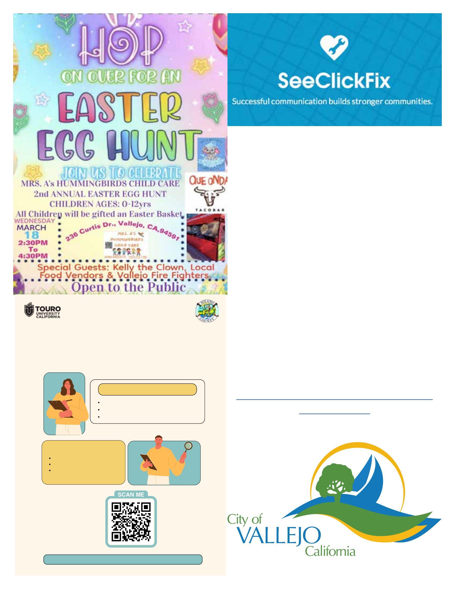 Gumawakamingisangbagongulatnanagbibigayngmgareal-timena updatesamgabukasatsaradongtiketngSeeClickFix-www.myvallejo.com/ seeclickfix-activity-report.Angbagongulatnaitoaynag-aalokngmasmalawak natransparencyatnagpapanatilisamgaresidentengimpormasyontungkolsa mgapatuloynapagsisikapupangmatugunanangmgaalalahaninngkomunidad.
