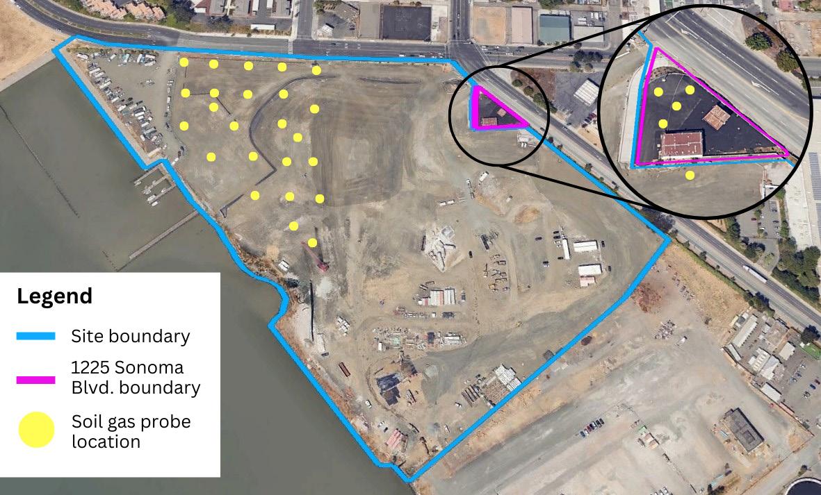 Se planificaron las siguientes actividades de muestreo posteriores a la rehabilitación en el Sitio y en la propiedad adyacente, 1225 Sonoma Boulevard, para evaluar las condiciones del gas del suelo (aire entre las partículas del suelo):