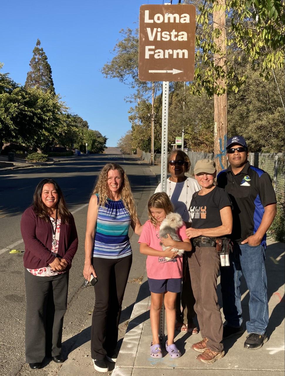 On hand for the sign unveiling, left to right: Public Works Director Melissa Tigbao; Councilmember Pippin Dew; her daughter, Angelina Costa, 8, with bunny, Cloud; Loma Vista Farm Board President Julia Allen; “Farmer” Rita LeRoy; and Patrick Hutchinson, Vallejo City Public Works.