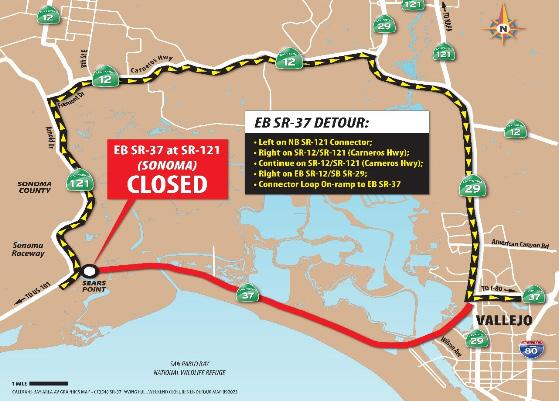 Weekend closures on eastbound (EB) SR-37 is scheduled on the weekend of May 3 & May 10. EB SR-37 will be closed and traffic detoured beginning at the NB SR-121 (Sears Point) in Sonoma.