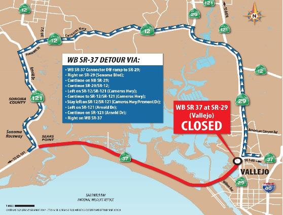 Motorists traveling westbound on SR-37 will need to exit right onto northbound SR-29 (Sonoma Blvd) in Vallejo and continue on NB SR-29