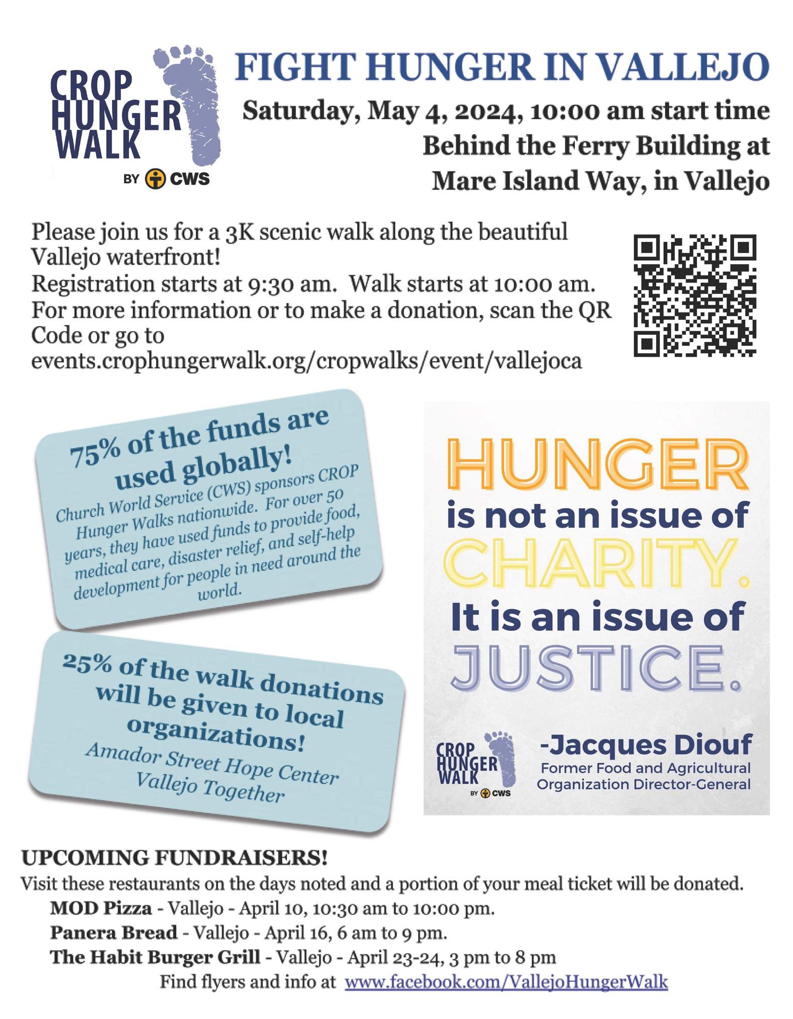 Please join us in the fight against hunger! The steps we take and funds we raise will make a difference in the lives of others. For more information, to participate as a team or individual, or to make a donation, please visit the website https://events.crophungerwalk.org/ cropwalks/event/vallejoca