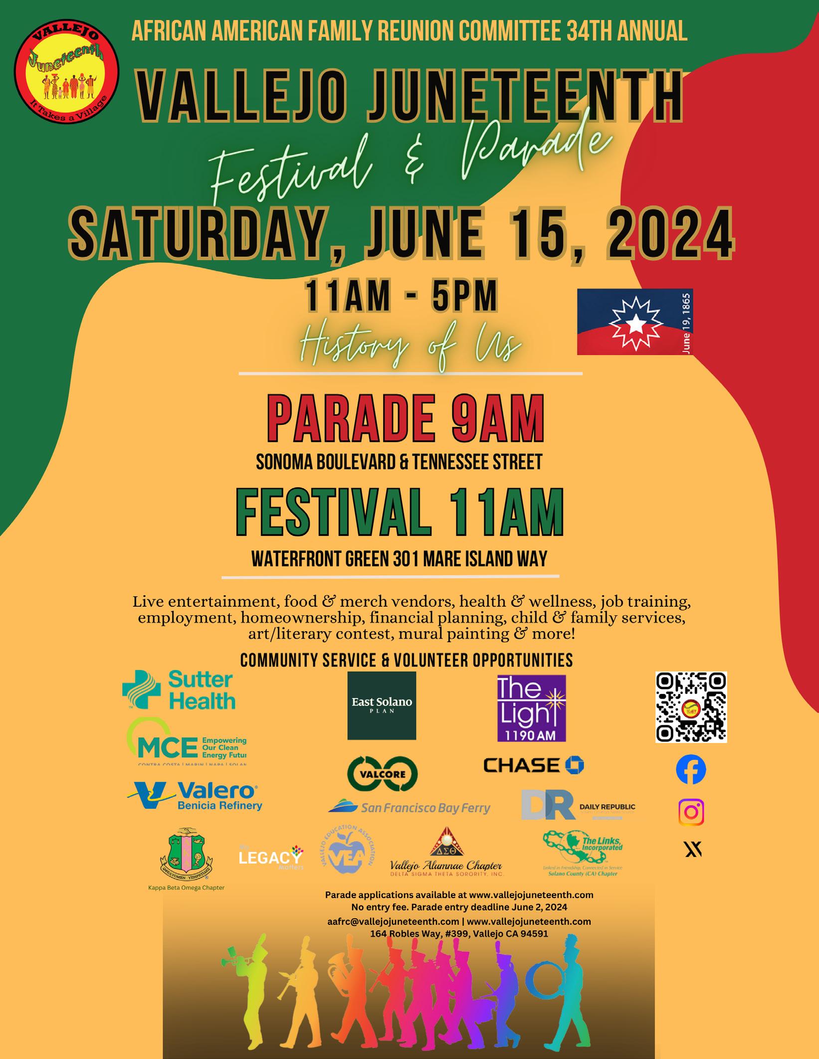 Organizers are preparing for Vallejo’s 34th Annual Juneteenth Festival on Saturday, June 15 from 11 am to 5 pm. The event sponsored by the African American Family Reunion Committee takes place at Barbara Kondylis Waterfront Green on Mare Island Way at Capitol Street. The celebration will feature a parade through downtown Vallejo.