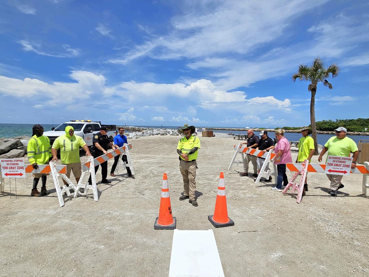 Dwayne Evans, Lou Casella, Andy Leisenring, James Clinch, Dan Tucci, Ricky Simpson, Tim George, Ashlee Castle, Brad Holahan and Mark Botelho remove barricades to the South Jetty on July 31, reopening the walkway to the public.