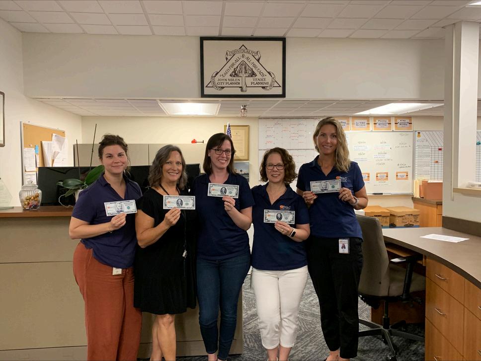 From left, Tracey Smith and Cordy Crane found themselves twinning at City Hall Sept. 19; Kendri Bruzon steps into Ashlee Castle’s shoes (better make that boots) at Public Works following Hurricane Helene; Utility Mechanic Lad Trcak replaces an LED light at the corner of W. Venice Avenue and Business 41 after Hurricane Milton; Mercedes Barcia’s birthday and Toni Cone’s Certified Municipal Clerk designation are celebrated in September by City Clerk Kelly Michaels and Tracey Smith.