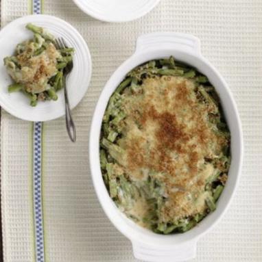 When the green beans are done, remove from the oven. Preheat the broiler. Transfer half the green beans to a 2-quart broiler-safe baking dish. Spread half the sauce over the green beans. Add the remaining green beans and top with the remaining sauce.