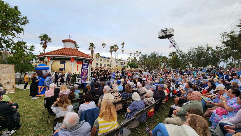 Over 1,000 people came together to celebrate the Chabad of Venice & North Port’s Grand Chanukah Festival Dec 29 in Centennial Park The event included the lighting of a 16-foot menorah, a 20-foot interactive dreidel house, Klezmer Band, and a Hebrew School performance. VFR dropped hundreds of chocolate gelt coins from the ladder truck for children Mayor Nick Pachota recognized the week as “Chabad Week” with a proclamation, below left with Rabbi Sholom Schmerling; and new VPD Chief Andy Leisenring and retiring chief Charlie Thorpe, below right, also participated.