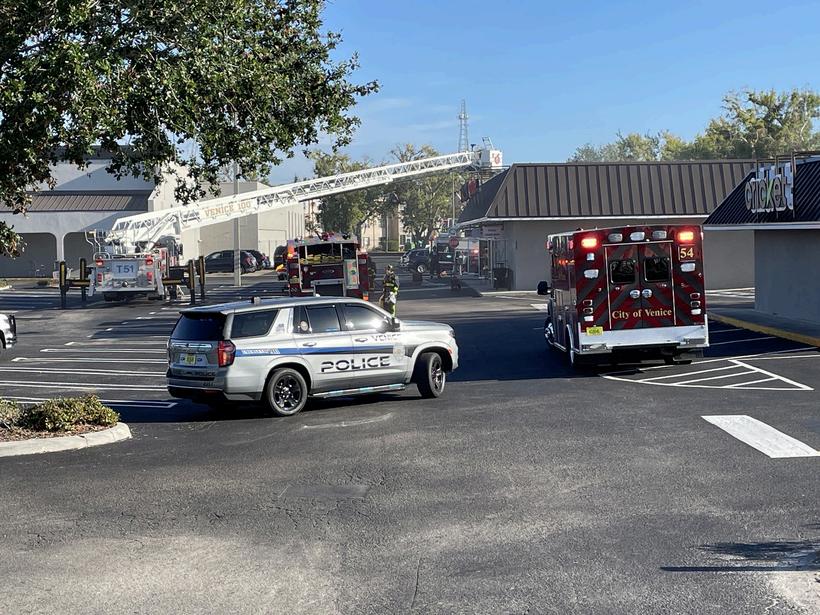 At top left, Venice Fire Rescue and Public Works respond to a mobile shredder that caught fire on Dec. 26. No injuries were reported The culprit was likely a battery that wasn’t disposed of properly
