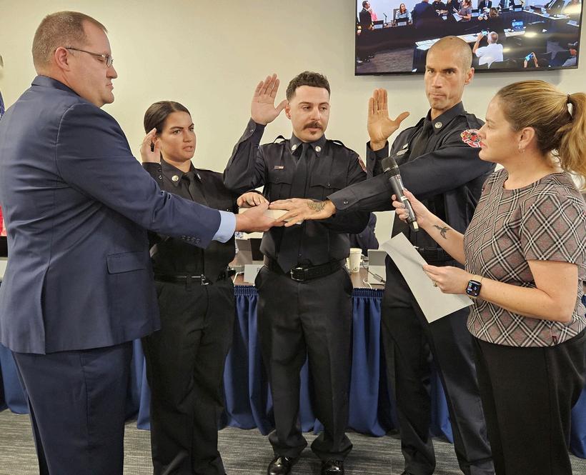 Deputy City Clerk Barcia swears in new VFR Firefighter/Paramedic Alejandro Lopez during the Dec. 10 Council meeting, as Mayor Pachota assists.