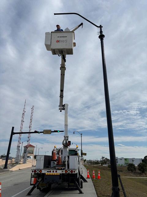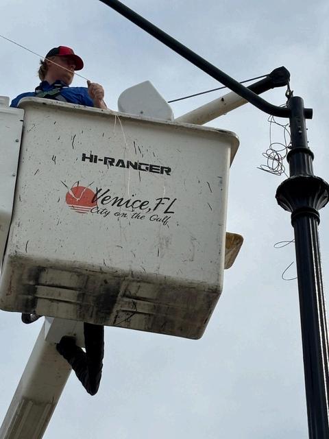 Above right, Electrical Maintenance Tech Chris Somers with Public Works replaces a decorative light pole Jan 14