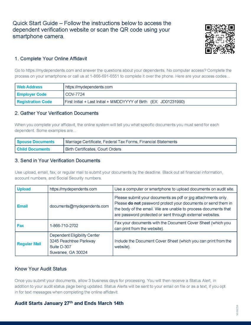 The Dependent Eligibility Audit (see Quick Start Guide at left) is being conducted to ensure the accuracy of our health benefits program and to manage costs effectively for both the City and its employees. Our independent vendor, Amwins, is reaching out only to employees who have dependents enrolled in the health plan with instructions for verifying dependent eligibility.