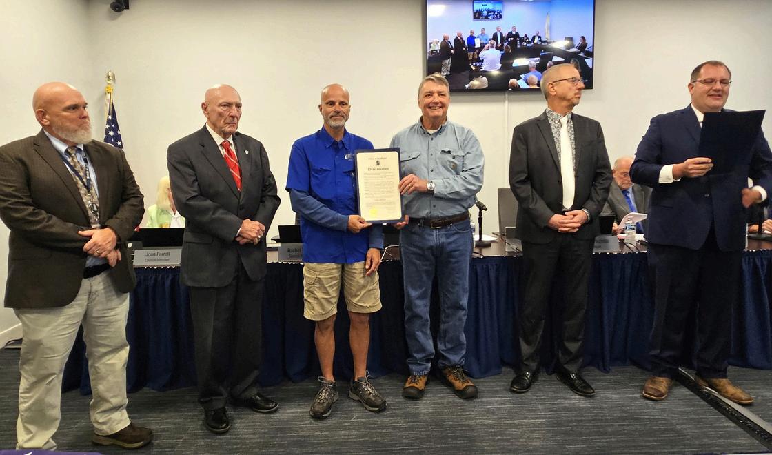 Mayor Nick Pachota recognizes Jan 17, 2025, as Florida Arbor Day during the Jan. 28 City Council meeting with a proclamation presented to Tree Crew Leader Scott Gorski and City Arborist Jim Yelverton. Public Works Director Ricky Simpson, City Manager Ed Lavallee, and Planning and Zoning Director Roger Clark look on