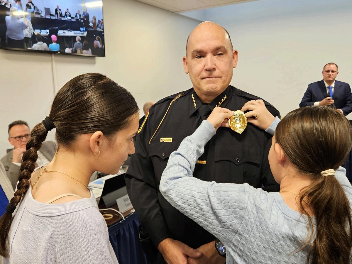 Leisenring placed his hand on a bible held by his mother Bonnie, who had traveled to Venice from Michigan for the ceremony. His wife Melissa and daughters Madison and Olivia then pinned on his badge.