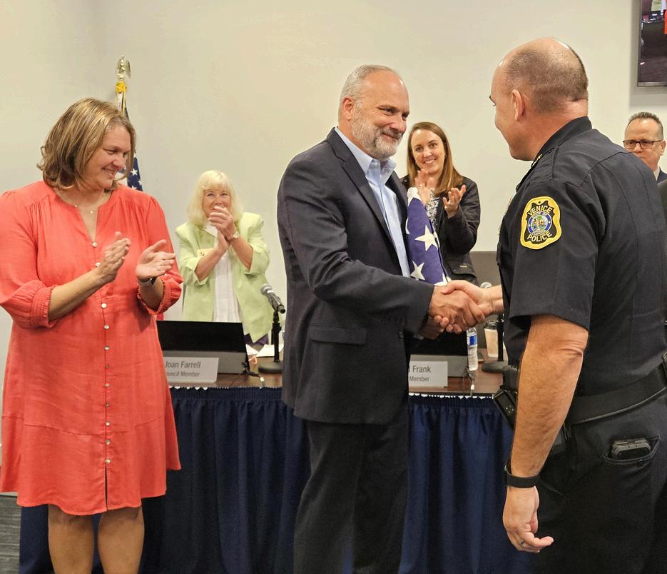 With his wife Tammy by his side, former Venice Police Chief Charlie Thorpe, who retired Jan 3, is lauded during the Jan 28 Council meeting with a retirement tribute. Thorpe's successor, Chief Andy Leisenring, presented him with a flag flown over the department, and City Manager Lavallee gave him a shadowbox of his chief badges and insignia