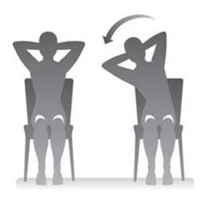 Sit upright with your feet on the ground. Place hands behind your head with elbows out to the side.