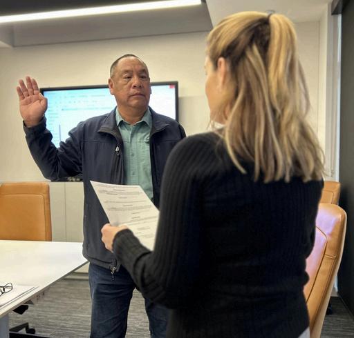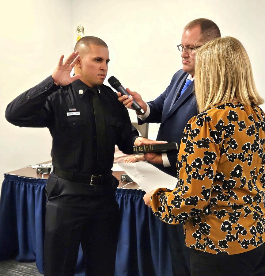 New Firefighter/EMT Jorge Lopez is sworn in during the Jan 14 City Council meeting by City Clerk Kelly Michaels, as Mayor Nick Pachota assists. Jorge's mother Marlene then pinned on his badge.