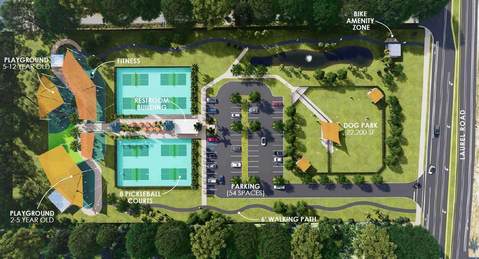 With the 5-acre park's completion anticipated for spring 2026, it will feature eight pickleball courts, a dog park, fitness equipment, two shaded playgrounds, a wide walking and running path, and more (rendering at bottom).