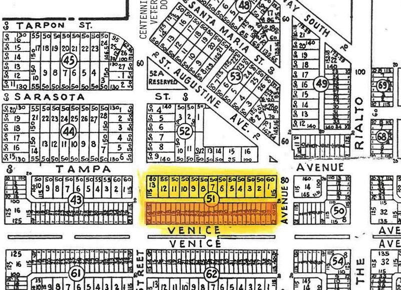 Originally, John Nolen’s 1926 plan did not call for a park in Block 51 (today’s Centennial Park.) Instead, Nolen divided Block 51 into 40 lots, with 27 narrow lots fronting Venice Ave. designated for businesses. The remaining 13 lots were wider and fronted Tampa Ave. as residential lots.