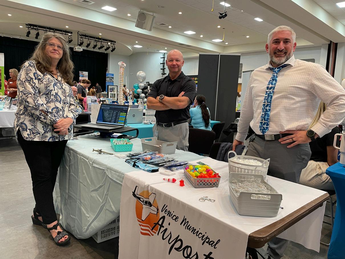 At left, Venice Municipal Airport Office Assistant Penny Elie, Airport Community Outreach Manager David Surwilo and Airport Manager Nick Dumas; and at right, Historical Resources Manager Harry Klinkhamer representing the Venice Museum at the Venice Chamber Community Expo Oct. 15 at the Venice Community Center.
