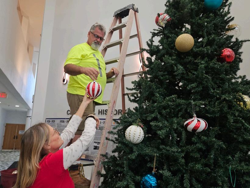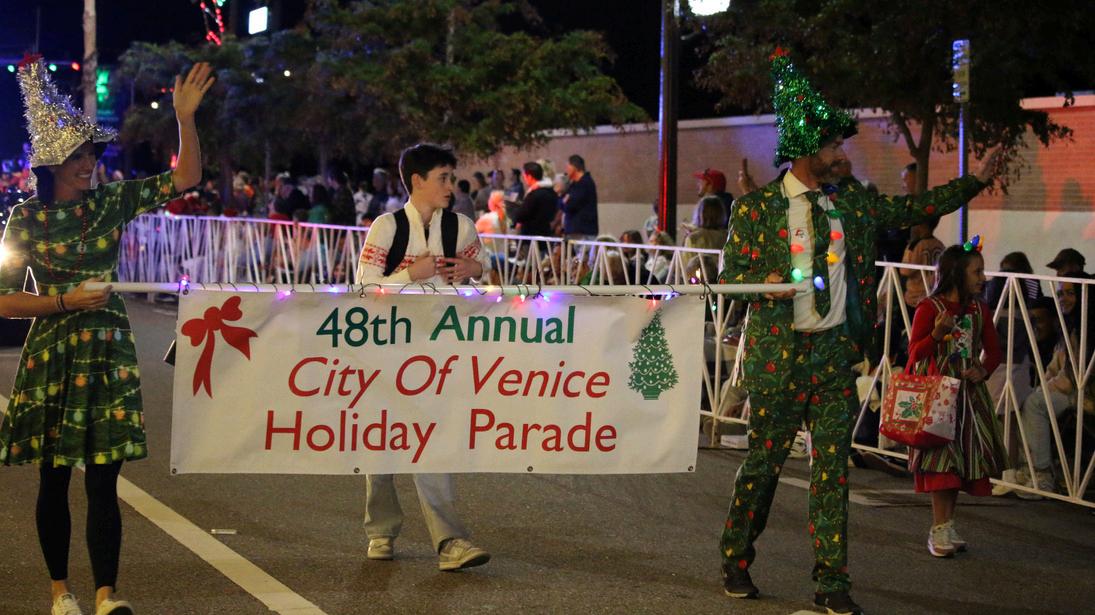The Mayor’s Hometown Christmas Tree Lighting, presented by Venice MainStreet with Mayor Nick Pachota, was held in Centennial Park Nov. 29 and featured performances by First Baptist Church’s Voices of Venice, the Venice Chorale, food trucks, and a visit from Santa Public Works staff built the box the tree stands on, at left. At right, Ashlee Castle is pictured with the Mayor and his dog, Willow.