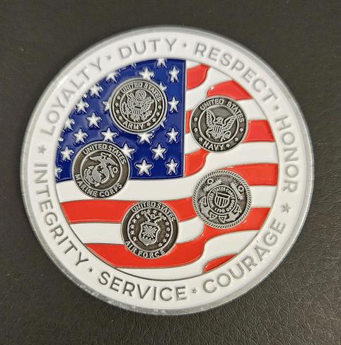 At right is the front and back of the Veterans Challenge Coin designed by Rebecca and Cordy, featuring the logos of the military branches