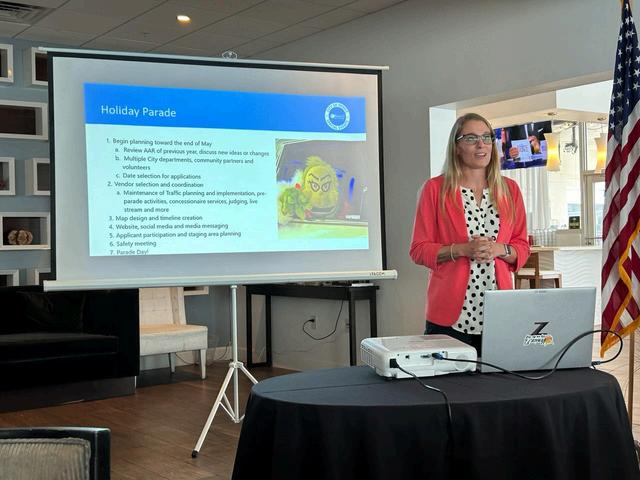 At right, Special Events Coordinator Brianne Lorenz gives a presentation on the City’s Special Events program and safety at the Holiday Parade to the Sertoma Club of Venice Nov. 7 at Hotel Venezia.