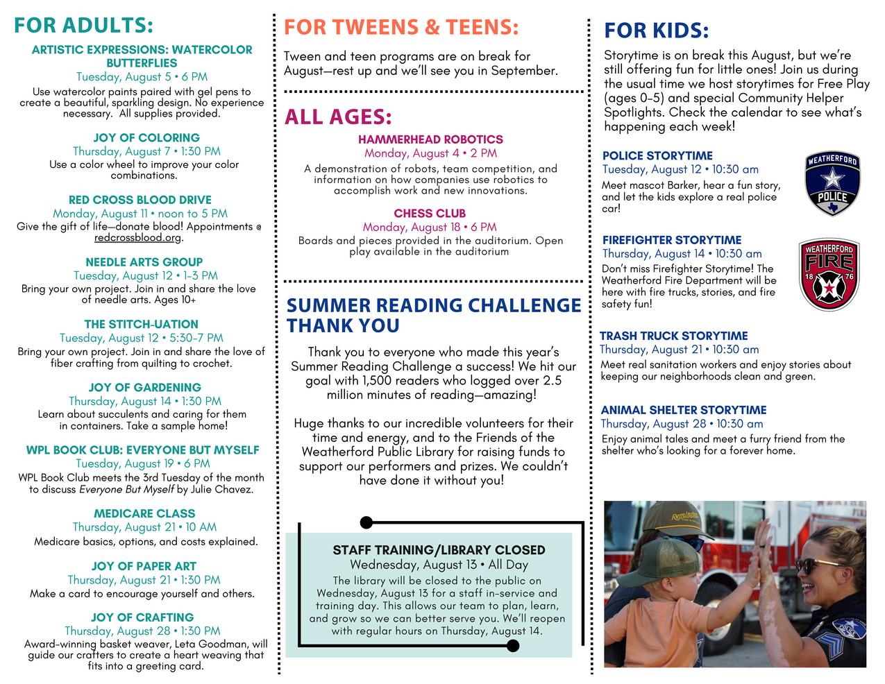The Summer Reading Challenge was a huge success with 1,500 readers logging over 2.2 million minutes. Thank you to everyone who joined in and made this summer one for the books